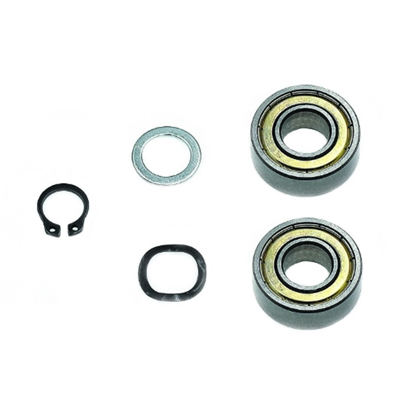 Axe en acier galvanisé avec 2 roulements, 1 circlips et 2 rondelles permettant le pour maintien des roues sur remorque vélo enfants de la marque ATOO.