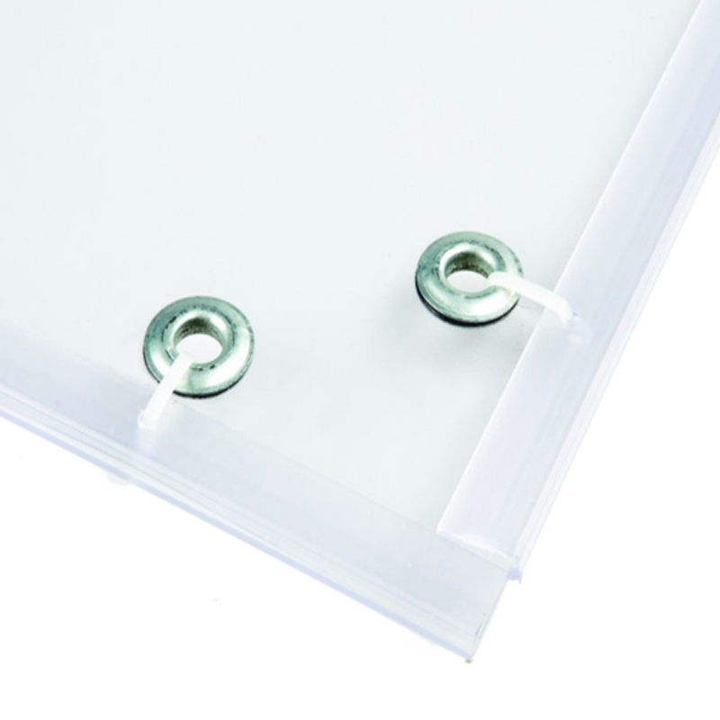 Un système de deux feuilles en plastique transparent mises dos à dos avec œillets, entre lesquelles une affiche (votre publicité) est insérée par le haut et maintenu par des colliers de type RYLSAN sont livrés au nombres de 12 pièces.